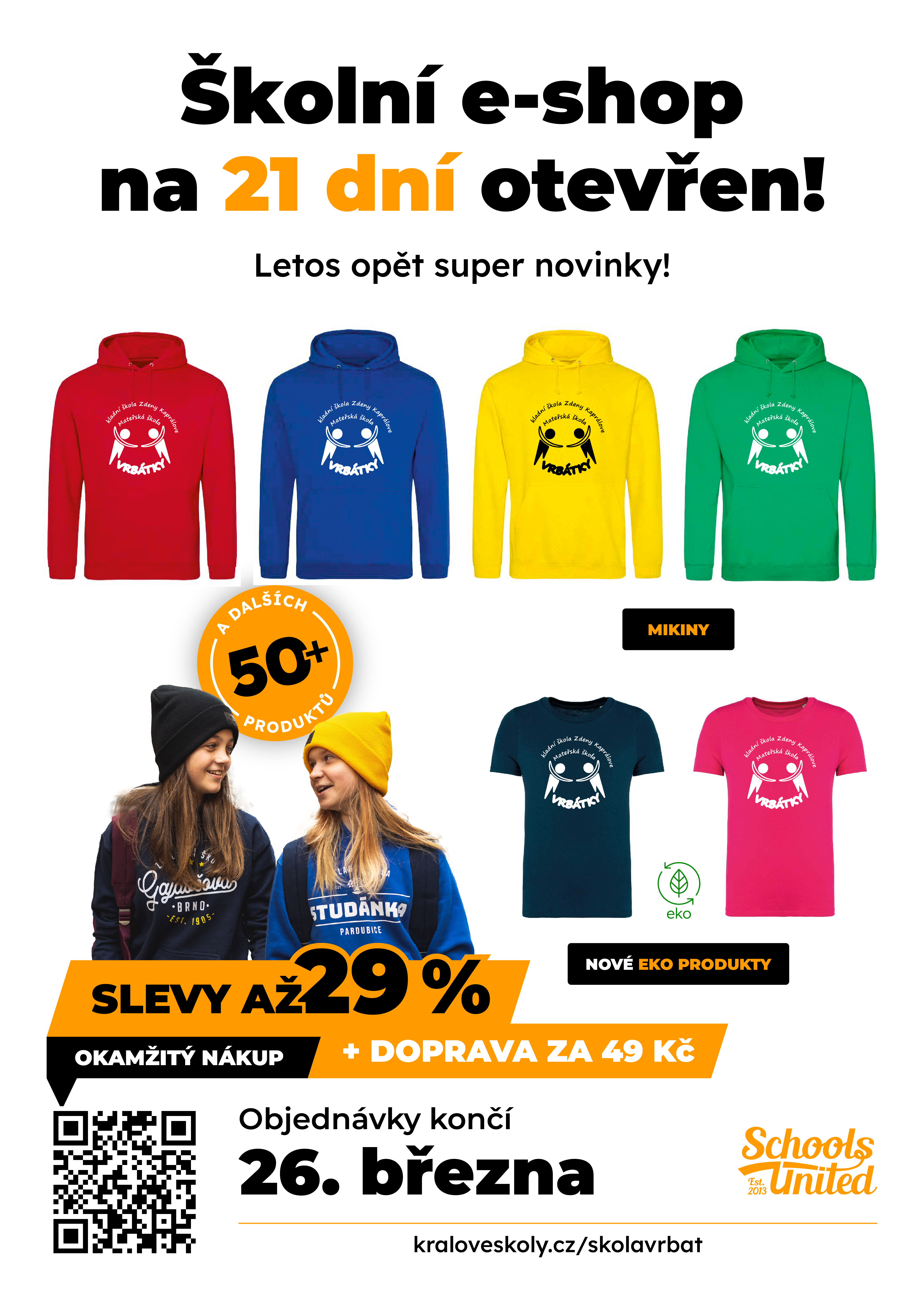 znovu Vám nabízíme nákup oděvů s logem naší školy. E-shop bude otevřen do 26. 3. 2024. Potěšující je, že některé výrobky jsou zlevněny až o 29 %.