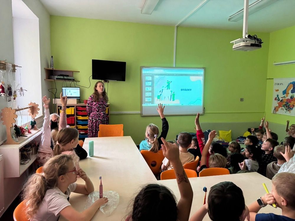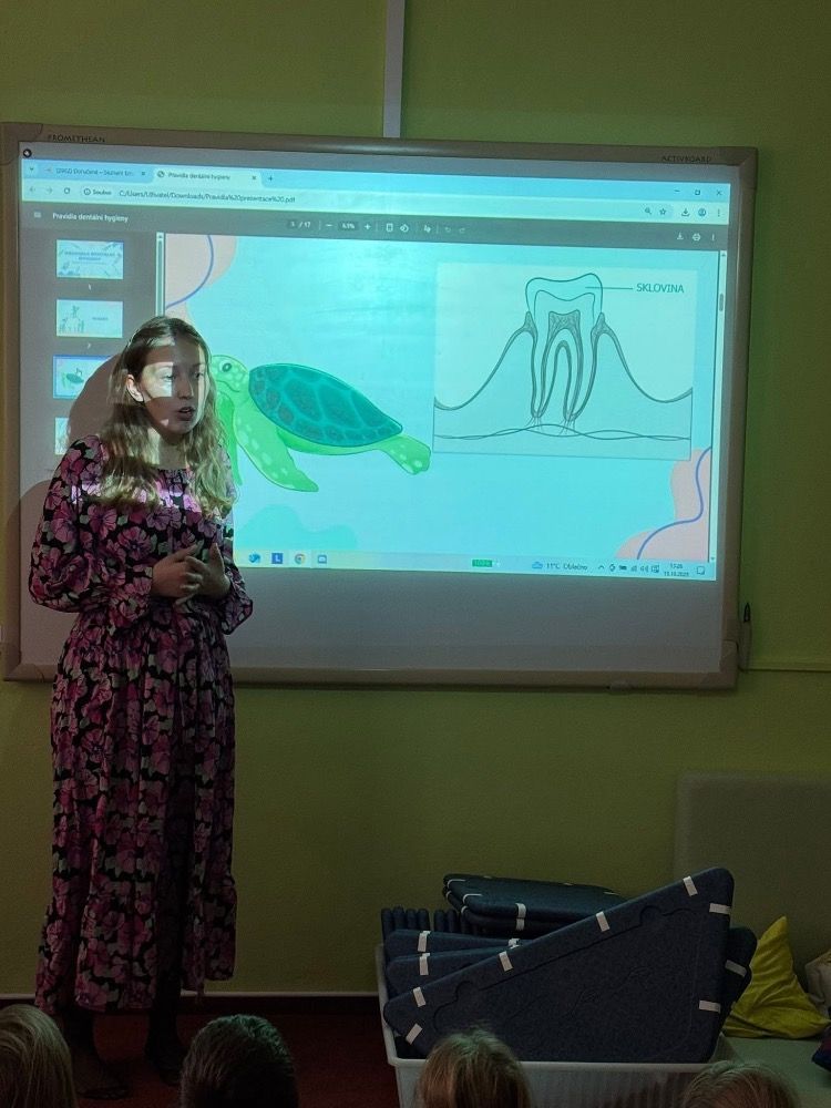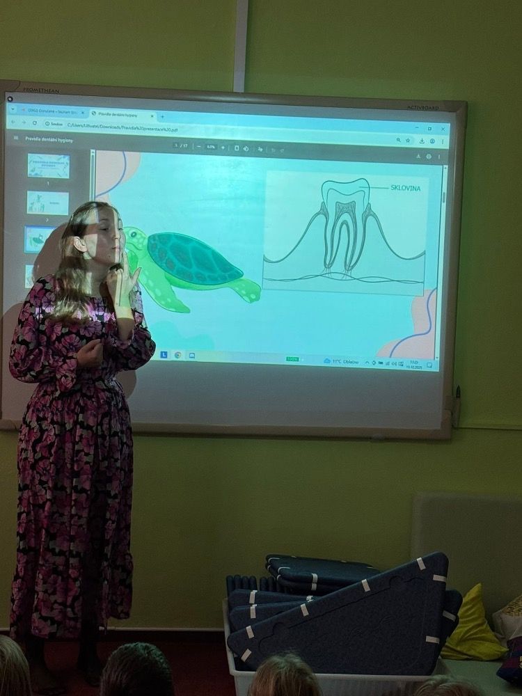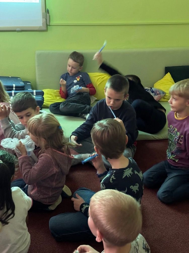 Hned na začátku dětem vysvětlila, proč je důležité si zuby čistit pravidelně a správně. Ukázala, jak správně si zuby čistit, aby na nich nezůstávaly zbytky jídla a aby se netvořil zubní kaz. Děti si mohly čištění samy vyzkoušet a zjistit, že i malá změna v pohybu kartáčku může udělat velký rozdíl.