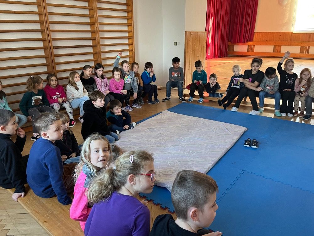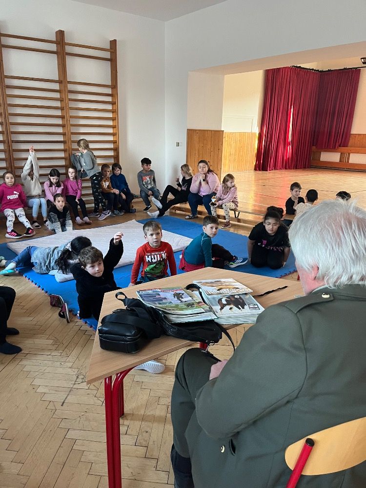 Pan myslivec začal povídáním o tom, co všechno obnáší péče o lesní zvěř. Děti se dozvěděly, že myslivci nejen loví, ale hlavně se starají o to, aby měly zvířata v lese dostatek přirozené potravy, vody a klidné prostředí.